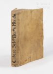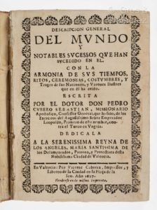 CUBERO SEBASTIAN (Pedro). Descripción general del Mundo y notables sucesos que han sucedido en el. Con la armonia de sus tiempos Valencia, Por Vicente Cabrera, 1697. Petit in-4, [8] f., 342 p., velin souple ancien récemment réemboîté, dos lisse, titre à l’encre (reliure en partie déboîtée, gardes absentes, couv. des contreplats renouvelée, forte mouill. en marge en début de vol., qq. ff. réparés en marge en fin de vol.). Edition originale de ce récit du voyage de Pedro Cubero (1645-1700), prêtre espagnol, voyageur et écrivain, qui fut le premier à faire le tour du monde dans le sens inverse de Magellan et Elcano, avec la particularité d’en avoir effectué la plus grande partie par voie terrestre à travers l’Europe occidentale et orientale, l’Asie occidentale et centrale, et l’Amérique du Nord. Elle est ornée d’une gravure sur bois à pleine page montrant la Vierge de los Desamparados, patronne de la Communauté valencienne.