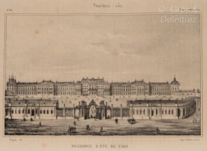 CZYNSKI (Jean) [Dir.]. La Russie pittoresque. A Paris, au Bureau central, 1837. Deux tomes en un volume grand in-8, VIII-383 p. en continu, pl., demi-veau vert à coins, dos lisse à décor doré romantique, titre et tomaison dorés, filet doré sur les plats, tranches marbrées (coiffes de tête, coins et coupes usés, mors frottés, rousseurs parfois soutenues). Ouvrage illustré de 48 planches en lithographie, montrant des édifices, des paysages, des scènes historiques et d’autres avec des personnages en costume du temps.