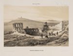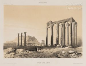 DU MONCEL (Théodore). Athènes monumentale et pittoresque. Collection composée de quatorze planches lithographiées, d’un panorama de la ville et d’un texte explicatif avec gravures sur bois. Paris, Gide, 1846. Grand in-folio oblong, [1] f., 9 p. à 3 col., fig., pl., demi-basane rouge à coins époque, dos lisse et muet peut-être remplacé, titre et filets dorés au plat sup., coins restaurés (sans le panorama annoncé). Très rare et splendide recueil dû au vicomte Théodore Du Moncel (1821-1884), homme de sciences, voyageur et dessinateur. Il est illustré de 14 grandes vues d’édifices et de paysages d’Athènes, dessinées et lithographiées par l’auteur, précédées d’un texte explicatif sur les antiquités d’Athènes, illustré de vignettes gravées sur bois. Liste des planches : I. Propylées et temple de la Victoire (Aptère). II. Parthénon. III. Erechthéum. IV. Temple de Thésée. V. Tour des vents. VI. Monuments de Philoppapus et de Lysicrates. VII. Porte de l’agora. VIII. Poecile. IX. Arc d’Adrien. X. Temple de Jupiter olympien. XI. Théâtre d’Hérodes Atticus. XII. Ancienne église métropolitaine. XIII. Eglise des Camnicarées. XIV. Anciennes Eglises Byzantines près la Tour des vents. La BnF ne conserve de ce livre qu’un exemplaire semble-t-il similaire, daté de 1845, avec une variante du titre qui commence par « Vues pittoresques des monuments d’Athènes », suivie du même sous-titre, et un texte de 7 pages. Manque à Atabey et à Blackmer.