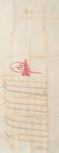 [Manuscrit]. [Empire Ottoman]. Grand berat d’investiture au nom du Sultan Mustafa III (r. 1757-74) nommant l’archevêque catholique apostolique romain des îles de Naxos et Paros. Istanbul, Turquie ottomane, daté du 10 dhu al-qi da 1172 H/5 juillet 1757. En turc ottoman, la tughra du sultan finement exécutée à l’encre rouge, le texte de 13 lignes en divani écrit alternativement à l’encre dorée, rouge et noire sur un fond moucheté d’or, sequins à l’or entre les lignes, daté dans la dernière ligne, pliures, salissures déchirures et petits manques. Dim. : 155,5 x 59,7 cm. Un berat est un ordre écrit du sultan ottoman émis par la chancellerie impériale et portant son chiffre (tughra). Il s’agit d’un type particulier de document permettant d’accordant un privilège ou nommer un agent de l’Etat. Ce bel exemple est un brevet de nomination d’un certain Stefani à la charge ecclésiastique d’archevêque catholique apostolique romain des îles de Naxos et Paros. Il s’agit très probablement de Pietro Martire de Stefani, né en 1710 et archevêque de Naxos jusqu’en 1773 (voir à son sujet McCormick, Andrew, « An Embattled Catholic Archbishop between Latins and Greeks in the Ottoman Aegean », dans Global Reformations : Transforming Early Modern Religions, Societies, and Cultures, sous la direction de Nicholas Terpstra, Londres, 2019, p. 195-209 et https://www.catholic-hierarchy.org/bishop/bstefani.html). Le brevet a été établi suite à la prise de fonction illégale d’un dénommé Masakor qui a été destitué de ses fonctions. Pour une discussion sur les firmans ottomans, voir Aysegül Nadir (dir.), Osmanli padisah fermanlari, Londres, 1986 ainsi que Ismet Binark (dir.), Osmanli Fermanlari, Istanbul, 1992. Au sujet de la nomination des évêques et archevêques catholiques au sein de l’Empire ottoman, voir Elisabetta Borromeo, « Le clergé catholique face au pouvoir ottoman : les brevets de nomination (berât) des évêques et des archevêques (17e siècle) », dans Contacts and controversies between Muslims, Jews and Christians in the Ottoman Empire and pre-modern Iran, Würzburg, 2010, p. 207-22. A berat of Sultan Mustafa III (r. 1757-74) granting an ecclesiastical office to Pietro Martire de Stefani, Istanbul, Ottoman Turkey, dated 10 dhu al-qi da 1172 H/5 juillet 1757.