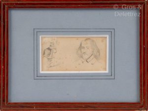 [Dessin]. [Espagne]. Ecole Française du XIXe siècle. Don Quichotte en pied et en portrait. Dessin, graphite sur papier H.6,5 ; L. 12cm B.E. (Quelques rousseurs)