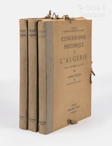 ESQUER (Gabriel). Iconographie historique de l’Algérie depuis le XVIe siècle jusqu’à 1871. Paris, Plon, 1929. 3 volumes in-folio, en feuilles, sous 3 portefeuilles éditeur (menus défauts d’usage aux port., rares rousseurs sur qq. pl.). Important ouvrage documentaire composé de 345 planches précédées d’un texte explicatif.