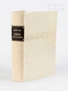 GOLIUS (Jacob). Lexicon arabico-latinum, contextum ex probatioribus orients lexicographis. Accedit index latinus copiossisimus, qui lexici latino-arabici vicem explere possit. Lugduni Batavorum, Typis Bonaventurae & Abraham Elzevir, 1653. In-folio, [6] f., 2321 col., [20] f., texte sur deux colonnes, reliure récente plein parchemin ivoire, dos lisse, pièce de titre brune, titre et tranches anciennement dorées (leg. rousseurs, titre un peu défraîchi, dernier f. sali et usé sans manque). Edition originale de cet important dictionnaire arabe-latin, qui fut la référence pendant 150 ans, jusqu’à ce que le dictionnaire de Freytag paraisse. Jacob Golius (1596-1667) est un orientaliste néerlandais, élève de Erpenius, à qui il succéda à l’université de Leyde. Ce dictionnaire est son plus important travail basé sur la Sihah du grammairien arabe Al-Jauhari (Philologia Orientalis, 314. Schnurrer, 79).