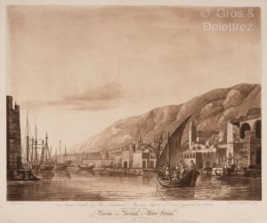 [Gravure]. [Tunisie]. Valentine GREEN et Francis JUKES Bason and Arsenal at Porto Fartina 1783 Eau-forte et aquatinte imprimée à l’encre brune H.49 ; L. 55 cm Vue de Tunis, montrant un port en contrebas de collines escarpées, avec des fortifications et des canons à gauche, et plusieurs navires amarrés dans le bassin protégé par un mur à l’extrême gauche ; avec des personnages sur le quai à droite, observant un petit voilier à voile triangulaire au premier plan ; d’après Tulin. B.E.