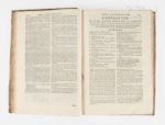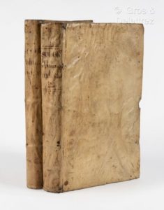 SOLORZANO Y PEREYRA (Juan de). Politica Indiana dividida en seis libros en los que, con gran distincio, y estudio, se trata, y resuelve todo lo relativo al descubrimiento, descripción, adquisición, y retención de las mismas Indias Madrid, Imprenta Real de la Gazeta, 1776. 2 vol. in-folio, [8] f., 438-21 p. + [2] f., 522-132 p., parchemin souple ivoire de l’époque, titre à l’encre au dos traces de lacets, (petit accroc au bord du plat supérieur du vol. 2, rares rousseurs). Quatrième édition de la Politica Indiana de Juan Solorzano Pereyra (1575-1655), ouvrage fondamental pour la connaissance de la politique suivie par l’Espagne en Amérique après la découverte des Indes occidentales. Professeur de droit formé à l’université de Salamanque, Solorzano fut nommé au service de la Couronne dans les Indes en 1609. « Avec sa nomination, Don Juan se voit confier l’importante tâche de compiler les règlements indiens épars. En janvier 1610, il s’embarque pour les Indes et arrive à Lima [où] il occupe le poste d’oidor de la cour royale jusqu’à son retour dans la péninsule seize ans plus tard ». Dans son ouvrage divisé en six livres, ce magistrat voué au service royal dans les Indes et à la Cour, traite notamment de la découverte des Indes, de leur description, leur acquisition, leur gouvernement particulier, de la liberté, de l’état et de la condition des Indiens, des tributs, dîmes, des aspects spirituels et ecclésiastiques dans les Indes, &c. Cette 4e édition est corrigé et augmentée de notes par Francisco Ramiro de Valenzuela. (Sabin 86537 ; Leclerc 1424 ; Palau, 318984).