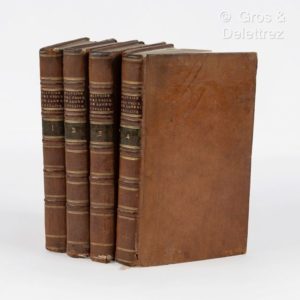 SOULES (François). Histoire des troubles de l’Amérique anglaise, écrite sur les mémoires les plus authentiques, dédiée à sa majesté très-chrétienne. Avec des cartes. A Paris, Chez Buisson, 1787. 4 vol. in-8, basane fauve époque, dos à 5 nerfs orné de doubles filets dorés, pièce de titre en maroquin rouge, et de tomaison en vert (défauts aux reliures dont 3 coiffes rongées, trav. de vers sur 4 plats, coins émoussés, petits trous de vers en marge de 3 vol., et accroc en marge d’une carte). Importante relation des évènements historiques de la Révolution américaine Elle est illustrée de 3 cartes gravées sur cuivre dont 2 rehaussées, montrant des parties de l’Amérique du Nord « pour servir à l’histoire de la dernière guerre », dont une comportant un cartouche illustré des chutes du Niagara, et : « Plan d’York en Virginie, aves les attaques et les campemens de l’armée combinée de France et d’Amérique ».