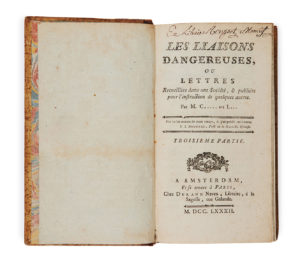 [CHODERLOS de LACLOS (Pierre-Ambroise-François)] — Les Liaisons dangereuses, ou Lettres recueillies dans une société, & publiées pour l’instruction de quelques autres. — Amsterdam, Paris, Durand neveu, 1782. — 4 parties en 2 vol. in-12...
