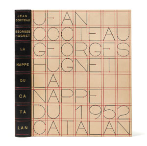 COCTEAU (Jean) et HUGNET (Georges) — La Nappe du catalan. — Paris, [aux dépens des Auteurs], 1952. — In-4 (28 x 22,5 cm), bradel demi-maroquin noir, plats de percaline grège ornés d’un motif de carreaux aux filets rouges et à froid, sur...