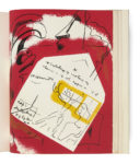 le premier plat, les carreaux sont occupés par les lettres constituant les noms des auteurs, le titre et la date, dos avec filets rouges simulant des nerfs, auteurs et titre en lettres dorées, tête rognée, couvertures et dos conservés, étui (Mercher – 1969) .