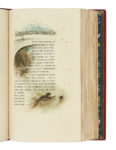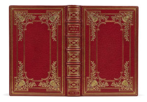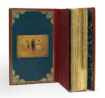 feuillages dorés aux angles, dos à nerfs orné de motifs dorés, doublures de maroquin bleu-vert avec encadrement de motifs dorés, plaque de cuivre émaillée et peinte insérée dans le premier contreplat, gardes de soie rouge, couvertures et dos conservés, tranches dorées, étui (M. Lortic) .