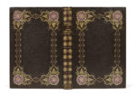 les plats encadrement d’un décor « à la cathédrale » composé de filets et ressauts dorés et à froid, avec rosaces de maroquin violet mosaïquées aux angles et petits losanges de maroquin rouge mosaïqués, dos à nerfs orné de même, tranches dorées, encadrement intérieur de maroquin marron avec filets et écoinçons dorés, doublures et gardes de soie violette, couverture conservée, étui (Joly fils) .