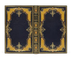 de maroquin ocre mosaïquées et ornées d’un semé de fleurettes dorées, listel de maroquin bordeaux mosaïqué, dos à nerfs orné de motifs dorés et mosaïqués, doublures de maroquin bleu nuit ornée d’un pavage de compartiments de maroquin ocre mosaïqué ornés de motifs dorés avec fleurette de maroquin rouge mosaïqué au centre, gardes de soie bleu nuit, tranches dorées, étui (Noulhac 1917) .