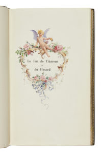 [LELOIR].– MARIVAUX (Pierre Carlet de) — Le Jeu de l’amour et du hasard. — Paris, L. Conquet, 1894. — In-8 (24,2 x 15 cm), maroquin bleu nuit, sur les plats vaste encadrement d’inspiration baroque de filets et motifs dorés, avec pièces...