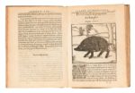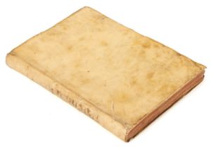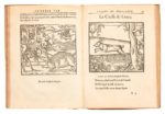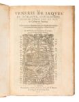DU FOUILLOUX (J.). La Vénerie. Paris, Galiot du Pré, 1573, in-4°, vélin souple, dos lisse avec titre manuscrit en long, tranches rouges mouchetées (reliure du XVIIIe siècle). Collation : 4 ff. n. ch. sign. A4, 136 ff. sign. A-Z4 et Aa-Ll4 ch. 1 à 136, et 4 ff. n. ch. sign. Mm4. Première édition parisienne, sortie des presses de Galiot du Pré (1491-1561). C'est la cinquième, les quatre premières ont été imprimées à Poitiers par les Marnefz. Pour la première fois un extrait du livre de Gaston Phebus concernant les chasses du daim, de l'ours, du loup, du bouc, du chevreuil, du connil… est inséré. Thiébaud loue sa beauté, et insiste sur sa rareté. Belle impression en lettres rondes. Un grand bois gravé figurant du Fouilloux (1519-1580) offrant son livre, et 56 figures selon la même technique. Ce sont des copies des gravures de la première édition publiée chez Marnefz en 1561, avec quelques différences. L'éditeur a ajouté un portrait de Charles IX qui ne figure pas dans les éditions précédentes. Le second titre est ici de l'état avec au verso le grand bois gravé figurant l'auteur offrant son livre. Exemplaire plaisant, bien conservé, de provenance princière. Il a appartenu à S.E.D Paolo Borghese dont la bibliothèque fut dispersée en 1892 à Rome. Décrit au catalogue de la première partie sous le n° 845, il était alors sans le deuxième feuillet de titre qui figure bien aujourd'hui. Il a été monté sur un onglet. La plupart des exemplaires cités par Thiébaud sont en reliure du XIXe siècle. Quelques ff. uniformément jaunis. On lit un filigrane au dernier feuillet blanc (chiffre AG sous un écu contenant cinq cercles ou billettes, l'ensemble couronné). Dimensions : 222 x 158 mm. Provenance : Paolo Borghese, prince de Sulmona (Cat. I, 1892, n° 845, « ... mais de fraîcheur et de conservations parfaites (témoins). »). Thiébaud, 299-300 (« Elle est extrêmement rare. ») ; Schwerdt, T. IV, p. 27 (22,1 x 14,7 cm pour un ex. relié en veau) ; Souhart, col. 150-151 (« Cette édition est très belle ; elle est bien imprimée et peut rivaliser avec les précédentes faites par les de Marnefz : elle est excessivement rare ») ; Frank (R.L.) - Maillard (A.), pp. 202-203 (pour un ex. relié par Marc Olivier sans indication de dimensions) ; [...], Jacques du Fouilloux, un homme de la Renaissance, musée d'art et d'histoire de Parthenay, 2019.