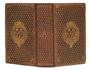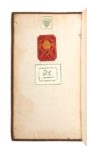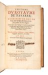 CHAPPUYS (G.). L'Histoire du royaume de Navarre, contenant de Roy en Roy, tout ce qui y est advenu de remarquable dès son origine et depuis que les Roys d'Espagne l'ont usurpé... Tirée des meilleurs Historiens, Latins, François, Espagnols, & Italiens, et dédiée au Roy par l'un des Secrétaires Interprètes de Sa Majesté. À Paris, chez Nicolas Gilles, 1596, in-8°, maroquin vert olive, jeu d'encadrement doré autour des plats, sur les plats semé de fleurs de lys, au centre, armes de France et de Navarre accolées, H couronné en angle, dos lisse orné du même décor, H couronné au centre, tranches dorées, traces de lacet (reliure de l'époque). Collation : 8 ff. n. ch. sign. ã4et ?4, 458 ff. ch. 1 à 876, sign. A-Z8, Aa-Zz8, Aaa-Kkk8, L4, M2,*4 (*4 blc). ÉDITION ORIGINALE, dédiée à Henri IV (1553-1610). Orphelin très jeune, Gabriel Chappuys (1546-1613) fut élevé par Claude Chappuys, ou Chappuis, le libraire ordinaire de la chambre de François Ier, qui lui confia le soin de lui constituer sa bibliothèque italienne, dont on sait qu'elle était destinée à son usage personnel. Il fut le successeur de François de Belleforest en 1585 au poste d'historiographe de France. Par ses nombreuses traductions, Chappuys occupa une place centrale dans la littérature et la transmission des savoirs en France sous Henri III et Henri IV. En 1596, Henri IV en fit son secrétaire interprète en langue espagnole. Avec son Histoire du royaume de Navarre, oeuvre qui s'inscrit dans son programme d'historiographie, Chappuys réaffirme sa fidélité à Henri IV, en rappelant qu'il a été de ceux qui l'ont soutenu par sa plume pendant la Ligue et qui l'ont suivi à Tours à la suite du parlement entre 1589 et 1594. Précieux exemplaire de dédicace aux armes d'Henri IV, le premier roi de France de la maison capétienne de Bourbon. Dans notre mémoire collective, Henri IV reste le roi qui mit fin aux guerres de religion (1562-1598). Robuste et intuitif, il sut allier fermeté sur le fond et habileté tactique pour arriver à ses fins. Les rédacteurs du catalogue Esmerian ont rappelé l'importance et la rareté de cette provenance sur un ouvrage concernant la Navarre. Le volume porte en fin de dédicace la signature autographe de l'auteur, et a été délicatement réglé à l'encre rouge. Par son vocabulaire ornemental, le semé de fleurs de lys accompagné d'un chiffre couronné dans les angles, on peut rapprocher cette reliure de celles qui recouvrent le Thevet d'Henri III et Louise de Lorraine de la fondation Fürstenberg-Beaumesnil, qui sont données à l'atelier de Clovis Ève. Nommé relieur du roi à partir de 1584, Clovis reprit l'atelier familial en 1581 et travailla jusqu'en 1633. Coiffes et mors discrètement, habilement et anciennement restaurés. Le volume est placé dans une chemise-étui de chagrin noir doublée de même peau. Dimensions : 175 x 105 mm. Exposition : Baltimore, 1957, n° 374. Provenances : Ripault (Cat. I, 1924, n° 293, reproduction), avec son ex-libris ; Cortland Bishop (Cat., 1948, n° 70, reproduction), avec son ex-libris ; Esmerian (Cat. I, 1972, n° 47, reproduction), avec son ex-libris. Dechaud (J.-M.), Bibliographie critique des ouvrages et traductions de Gabriel Chappuys, p. 453, C06a ; Hobson (A.R.A.), French and Italian Collectors and their Bindings..., 1953, p. 53 ; Courvoisier (D.), Fondation Fürstenberg-Beaumesnil, 2013, n° 161 pour le Thevet ; [...], Burrus : la bibliothèque d'un homme de goût, 2015, n° 51 pour le Del Rio relié pour Henri IV.