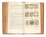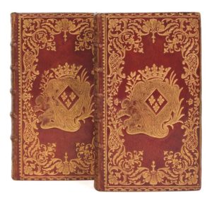 DUBUISSON (P.-P.) - [GASTELIER DE LA TOUR]. Armorial des principales maisons et familles du royaume, particulièrement de celles de Paris et de l'Isle de France. Paris, H.L. Guérin & L.F. Delatour, Laurent Durand, La Veuve J.B.T. Le Gras, 1757, 2 vol. in-12, maroquin rouge, plaque dorée frappée sur les plats, dos à nerfs ornés d'une fleur de lys plusieurs fois répétée, doublure et gardes de papier doré étoilé, tranches dorées (reliure de l'époque). Collation : T. I : frontispice, XVI pp. (titre compris), 194 pp. ch. 23-[216], 102 pl. gravées r°/v° ch. 12-215, soit 201 pl. d'armoiries / T. II : frontispice, 1 f. de titre, 212 pp. ch. 1-212, 2 ff. n. ch. (Errata / Approbation / Privilège), 84 pl. gravées r°/v° ch. 2-169, soit 168 pl. d'armoiries. Première édition de cet armorial parisien. « Le Sieur Dubuisson, Auteur de cet Ouvrage, dessine toutes sortes d'Armes & dresse toutes sortes de Cartes héraldiques dans le goût de celles du sieur Chevillard, avec beaucoup de soin et de correction ; il applique toutes sortes d'Armoiries en or. Sa demeure est rue Saint Jacques, vis-à-vis les Charniers de Saint Benoît. » Un frontispice gravé au burin par N. Le Mire, 6 planches d'armoiries gravées, et 360 planches, chacune formée de 9 blasons, soit un total de 3 240. Précieux exemplaire aux armes de Madame Adélaïde (1732-1800). Le tome II s'ouvre sur un frontispice non annoncé par Saffroy présentant Du Buisson Le Fils, relieur doreur rue Saint-Jacques. C'est à lui que l'on doit la plaque qui décore les plats de ce volume. G. Barber l'a reproduite dans son ouvrage consacré à la bibliothèque de James A. de Rothschild à Waddesdon Manor. Coiffe supérieure du T. II fragile. Dimensions : 165 x 89 mm. Provenance : bibliothèque Christian Lazard (Cat., 1967, n° 21). Saffroy, II, 24129 ; Cohen, I, 329-330 (« Livre recherché et qui n'a pas été remplacé ») ; Olivier, pl. 2514, fer n° 7.