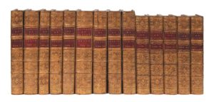 BUFFON (G.-L. Leclerc). Histoire naturelle des oiseaux. Paris, Imprimerie royale [I-VI], suivant la copie de l'Imprimerie royale [VII-IX], 1770-1784, 9 vol. de texte et 5 vol. de planches, soit 13 vol. in-folio, veau marbré, filets dorés autour des plats, dos à nerfs ornés, tranches dorées (reliure de l'époque). Collation : TEXTE / Vol. I : 1 f. de titre (1770), 2 ff. de table, XXII pp. (Plan de l'ouvrage), 313 pp., 1 f. (« Avis... ») ; vol. II : 1 f. de titre (1772), 2 ff. de table, 488 pp., 1 f. (« Avis... ») ; vol. III : 1 f. de titre (1774), 3 ff. de table, 282 pp., 1 f. (« Avis... ») ; vol. IV : 1 f. de titre (1777), 5 ff. de table, 405 pp., 1 f. (« Avis... ») ; vol. V : 1 f. de titre (1778), 5 ff. de table, 365 pp. mal chiff. 363 (deux fois pp. 129-130), 1 f. (« Avis... ») ; vol. VI : 1 f. de titre (1783), 5 ff. de table, 582 pp., 1 f. (« Avis... ») ; vol. VII : 1 f. de titre (1783), 1 f. (« Avis... »), 1 f. (« Avertissement »), 4 ff. de table, 435 pp. ; vol. VIII : 1 f. de texte (1793), 1 f. (« Avis... »), 4 ff. de table, 412 pp. ; vol. IX : 1 f. de titre (1784), 3 ff. de table, 423 pp., 1 f. (« Avis... »). PLANCHES / Vol. I : pl. 1 à 200 ; vol. II : pl. 201 à 400 ; vol. III : pl. 401 à 600 ; vol. IV : pl. 601 à 801 ; vol. V : pl. 802 à 1008. L'un des plus beaux livres illustrés français du XVIIIe. Les 1 008 planches qui accompagnent les textes rédigés par Guéneau de Montbeillard et l'abbé Bexon, revus par Buffon (1707-1788), en font l'un des plus grands livres d'ornithologie jamais publiés en France. 1 008 planches dessinées par François-Nicolas Martinet (1731-1800), interprétées sous la surveillance de E.-L. Daubenton, parent du collaborateur de Buffon, toutes mises en couleurs à l'époque. Ce nombre de planches est renseigné à la page II du T. VII. 973 montrent des oiseaux, et 35 figurent principalement des coléoptères et des papillons. Elles sont numérotées de 1 à 1 008. Dès 1766, Buffon, alors occupé par son Histoire naturelle, eut l'idée de faire cette série de planches : « Je fais faire en même temps, en planches enluminées, tous les oiseaux qui ont besoin d'être présentés avec des couleurs pour être bien reconnus, et cela abrège les descriptions de plus de la moitié. » Cette suite, sans doute destinée aux amateurs de cabinets d'histoire naturelle, a connu aussi un tirage grand in-folio. Exemplaire très pur, dont le coloris des planches est resté très frais. Il est bien complet des 35 planches de coléoptères et de papillons qui manquent souvent. Elles ont été également coloriées. Quelques très discrètes mouillures sans atteinte au texte des vol. I, III, VIII et IX. Au vol. IV du texte, la page 149 est restée en partie non ébarbée, ce qui a nécessité un retour de papier. Petite déchirure en marge de la p. 73 du T. V et de la pl. 387 du vol. II des planches. Les reliures sont bien conservées malgré des petits défauts : quelques épidermures et frottements avec pertes d'or aux volumes de texte. Petit manque à la coiffe supérieure du vol. II et petit travail de vers au mors supérieur du vol. IV du texte. Le vol. X de texte est absent. Dimensions : 332 x 245 mm pour les volumes de texte ; 314 x 228 mm pour les volumes de planches. Provenance : Dareste de Saconay, avec leur ex-libris du XVIIIe sur chaque volume, surmonté de la devise Fides obsequens. Cette famille d'origine lyonnaise reste propriétaire du château de Saconay, situé dans la Drôme. Ronsil (R.), Bibliographie ornithologique française, 1948, p. 76, n° 413 (1008 pl.) ; Anker, 76 (1008 pl.) ; Nissen, VBI, 158 : [...], Tous les savoirs du monde, BN, 1996, p. 266 (À propos de l'Histoire naturelle : « Refusant de réduire le rôle du savant à l'admiration passive de la nature, son ouvrage s'inscrit dans le même courant que l'Encyclopédie de Diderot et d'Alembert. »)