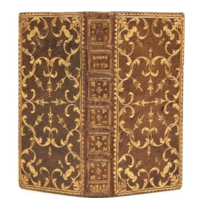 CALENDRIER de la cour tiré des éphémérides pour l'année mil sept cent soixante-treize... À Paris, Hérissant, 1773, in-24, maroquin olive, plats ornés au centre d'un décor doré avec motif doré en angle, dos à nerfs orné d'une fleur de lys répétée cinq fois, doublure et gardes de tabis rose, tranches dorées (reliure de l'époque). Collation : 164 pp. n. ch. dont 4 ff. blcs en début et fin de volume. Édition non citée par John Grand-Carteret. Le calendrier est interfolié d'un feuillet imprimé recto-verso destiné à porter ses pertes ou/et ses gains du jour. Exemplaire très bien conservé. Quelques annotations manuscrites anciennes au verso du premier feuillet de garde. Dimensions : 106 x 52 mm.