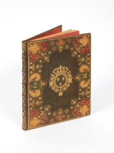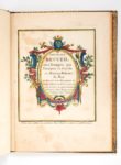 [JUILLETE]. Nouveau recueil de troupes qui forment la garde et maison militaire du Roy, de Monsieur et Monseigneur le comte d'Artois... Paris, Chez Juillete, rue de Bièvre place Maubert s'adresser à la Mde de Tabac, [ca. 1780], in-4°, maroquin vert olive, attributs militaires (faisceaux d'armes, tambours, drapeaux...) sur pièce de maroquin rouge, citron et vert, décor de fers dorés sur fond aux pointillés de part et d'autre des attributs, armes au centre, dos à cinq nerfs, 5 caissons ornés d'une même fleur de lys, un caisson titré « Revu des troup / 1775 », doublure et gardes de tabis rose, tranches dorées (reliure ancienne). Suite gravée d'un frontispice et de 14 planches : L'ensemble, monté sur onglets, a été colorié. Il a été placé dans une superbe reliure mosaïquée, dont les plats ont été frappés des armes royales. Elle est restée très bien conservée. Doublure et feuillets de garde renouvelés. Reliure citée par Louis Michon, ainsi décrite : « Reliure vide. DENTELLE. Louis XVI (aux armes). Rahir I, 118 / (pl.). Remontée sur Juillete. Nouveaux recueil de troupes... / (1775). » Dimensions : 219 x 164 mm. Provenances : M.L. de Montgermont (Cat., 1914, n° 567, « Riche reliure en mosaïque du dix-huitième siècle, aux armes du roi Louis XVI ») ; Rahir (Cat. I, 1930, n° 118, « Ce recueil... a été placé postérieurement dans une riche reliure du dix-huitième siècle, aux armes du roi Louis XVI », reproduction), avec son ex-libris ; Lazard (Cat., 1967, n° 29, « Cet exemplaire, monté sur onglets, a été placé dans une superbe reliure de l'époque, aux armes du roi Louis XVI », reproduction en frontispice), avec son ex-libris. Colas, II, 2217 (cite l'exemplaire Destailleur) ; Glasser, 221 ; Cohen, II, p. 755 (cite l'exemplaire Destailleur, veau marbré) ; [...], Bibliothèque du docteur Henri Polaillon, 2020, n° 87 (pour un ex. en vélin (vers 1900)) ; Michon (L.), Les Reliures mosaïquées du XVIIIe siècle, p. 82, n° 344.