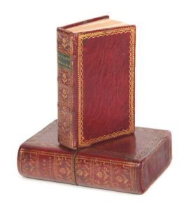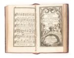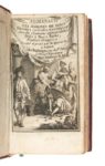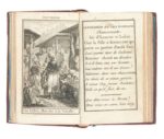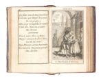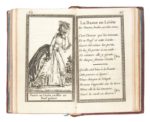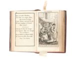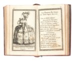 ALMANACH des marchés de Paris. Étrennes curieuses et comiques avec des chansons intéressantes, dédié à Marie-Barbe, fruitière orangère. À Paris, Chez Boulanger, [1782], in-24, maroquin rouge, filets droits ou crénelés autour des plats, dos lisse orné et titré « Année Nouvelle », doublure et gardes de tabis bleu, tranches dorées (reliure de l'époque). Collation : 1 titre gravé, 12 pp. gravées de calendrier, 12 gravures, 24 pp. gravées de texte, 1 f. « Boulanger doreur sur cuir et sur soie », 24 pp. gravées de musique. Rare almanach entièrement gravé. Titre et 12 figures, dessinés et gravés par Queverdo (1740-1797). Elles mettent en scène les petits métiers et cris de Paris à cette époque : Le bon Portugal : oranges fines, Marché au poisson, Les Écosseuses, La Marchande d'abricots, V'là le melon, v'là le sucré, ... Marrons bouillis, ils brûlent la poche, Du bon boudin gras et salé. Ces gravures avaient déjà paru en 1780 dans l'Itinéraire descriptif de Paris... Parmi les 24 pp. gravées de musique, on trouve une romance de J.-J. Rousseau. Est relié avec : Almanach galant des costumes français des plus à la mode. Dessinés d'après nature. Dédié au beau sexe. À Paris, Chez le Sr. Boulanger, [1782]. Collation : 1 titre gravé, 18 figures gravées de costumes, 36 pp. gravées de texte, 24 pp. gravées soit 2 pp. par mois pour ses pertes et/ou gains. Rare almanach entièrement gravé. 28 figures gravées de costumes, non signées : Dame de cour en grande étiquette, Dame en camisole qui se baigne, ..., Dame mettant sa jarretière, ..., Le Bourgeois marchand..., L'Homme de robe..., Le Financier en habit de velours brodé d'or, ..., La Paysanne des environs de Paris, en habit des Dimanches. Exemplaire bien conservé, relié très certainement dans l'officine de Boulanger, également doreur sur cuir et sur soie. Son premier propriétaire lui a fait faire au moment de la reliure un étui en maroquin rouge doublé de tabis bleu. Dimensions : 90 x 54 mm. Grand-Carteret (J.), 666 (« Les petites poésies qui accompagnent ces estampes sont des modèles de finesse et de polissonnerie galante ») et 669 pour l'Almanach galant ; Savigny de Moncorps, p. 76, n° 34 (« Cet almanach est un chef-d'oeuvre du genre » pour l'Almanach des marchés) ; Cohen, 20, avec les deux almanachs ; Portalis (R.), Les Dessinateurs d'illustrations au dix-huitième siècle, pp. 546-550 (pour Queverdo) ; Pichon, I, 1897, n° 142 (« Petits almanachs rares et recherchés ») ; non cité par Karen F. Beall.