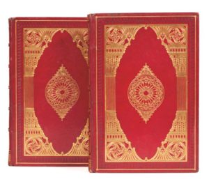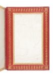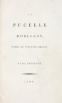 VOLTAIRE. La Pucelle d'Orléans, poème en vingt-un chants. [De l'imprimerie de la Société littéraire et typographique (Kehl)], 1786, 2 vol. gr. in-8°, maroquin rouge à grains longs, filet doré et roulette à froid autour des plats sertissant deux plaques dorées, une frappée au centre, dos à nerfs ornés, bordure intérieure décorée d'une large roulette dorée, doublure et gardes de soie moirée crème sertie d'une roulette dorée, tranches dorées (Thouvenin). Collation : T. I. : 1 f. de titre pp. [1-2], Avertissement des éditeurs pp. 3-12, Préface pp. 13-20, Chant premier à onzième pp. 21-213, Table des chants & arguments pp. [214]-215, 2 portraits et 11 figures ; T. II. : 1 f. de titre pp. [1-2], Chant douzième à vingt-et-unième pp. 3-192, Tables des chants & arguments pp. [193]-195, 2 portraits et 10 figures. Luxueuse édition de La Pucelle d'Orléans, poème héroïque en vingt et un chants, sortie des célèbres presses de Kehl, fondées par Pierre-Augustin Caron de Beaumarchais (1732-1799) avec l'ambition d'éditer les oeuvres complètes de Voltaire (1694-1778) à l'abri de la censure royale française. Un frontispice, deux portraits, 21 pl. hors texte par Jean-Michel Moreau, dit Moreau le Jeune (1741-1814). On connaît un recueil de 31 dessins originaux du même pour La Pucelle qui ne furent pas retenus ; il a successivement appartenu à Mahérault, Beraldi et Esmerian. Il a été récemment proposé aux enchères. L'un des très rares exemplaires imprimés sur peau de vélin. Van Praet en recense cinq. Relié par J. Thouvenin (1790-1834), il est ainsi constitué : - d'une suite de 23 figures d'après Desenne, avant la lettre, sur chine appliqué, dont deux portraits. Elles remplacent celles de Moreau ; - d'un portrait de Voltaire par Ficquet d'après La Tour (T. I) ; - d'un portrait de Jeanne d'Arc, gravé par Marcenay (T. II), en 2 états dont un avant la lettre, celui-ci relié à la fin du premier volume ; - d'un billet manuscrit signé Voltaire. Joseph Thouvenin relia un exemplaire de La Henriade de 1819 avec les mêmes plaques dites « à la cathédrale » que celles utilisées pour nos deux volumes. Cette Henriade est décrite avec photo sous le numéro 45 de l'ouvrage de Paul Culot, Relieurs et reliures décorées en France à l'époque romantique. Il fut actif de 1813 jusqu'à sa mort en 1834. Sa clientèle compta de nombreux bibliophiles, parmi eux Charles Nodier et Armand Bertin. Dimensions : 242 x 167 mm. Provenance : Sir Abdy (Cat. I, 1975, n° 346). Bengesco, I, n° 508 (notre édition, datée de 1784 et 1785 pour le tirage courant en un vol. in-8°, et 1786 pour les ex. sur vélin en 2 vol. in-8°) et IV, n° 2142 (pour l'édition des oeuvres de Kehl, 1784 & 1785-1789) ; Cohen, II, p. 1110 (« Les très rares exemplaires sur peau de vélin que l'on connaît de la Pucelle…, avec l'adresse de Kehl ne sont pas de l'édition in-4° (1789) mais de l'édition de 1785, de format in-8° ») ; Van Praet, Catalogue des livres imprimés sur vélin…, VI, p. 98, n° 288 et p. 165, n° 288 ; Portalis (R.), Les Dessinateurs d'illustrations au dix-huitième siècle, pp. 442, 451 & 464.