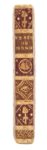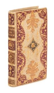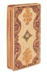 ÉTRENNES intéressantes des quatre parties du monde et des troupes de France pour l'an sextile, IIIe de la République. À Paris, Chez Langlois-Demorain, [1794], in-24, maroquin rouge, grande réserve festonnée de maroquin blanc avec décor de bonnets phrygiens sur fond de pointillés or, au centre pièce de maroquin vert ornée de même, dans le sens de la hauteur, au centre, en tête et en pied, fleuron mosaïqué de maroquin citron, dos à faux nerfs mosaïqué de maroquin rouge ou vert olive, orné d'un bonnet phrygien et de l'œil de la vigilance, doublure et gardes de papier floral polychrome sur fond or, tranches dorées (reliure de l'époque). Collation : 128 pp., 2 ff. repliés de cartes. Une Mappe-Monde dépliante avec au verso une carte de l'Europe et une carte de la France, à la fin, un feuillet dépliant, avec au recto une carte de l'Asie et une de l'Afrique, au verso, une carte de l'Amérique septentrionale, et une carte de l'Amérique méridionale. Intéressant modèle de reliure révolutionnaire orné de bonnets phrygiens et de l'œil de la vigilance. Exemplaire très bien conservé. Dimensions : 99 x 54 mm. Brimo (A.), Les Reliures de la Révolution française, 1988, p. 56, n° 40.