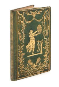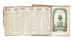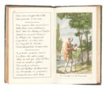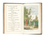 HORTENSIA (L'). Almanach charmant. À Paris, Chez Janet, [1810], in-24, maroquin vert, plats décorés d'une plaque dorée avec figure allégorique, dos lisse orné, tranches dorées (reliure de l'époque). Collation : calendrier daté 1810 en 2 feuilles repliées, 1 f. de titre gravé, 12 pp. ch. 1 à 12, 24 pp. « Ariettes nouvelles » n. ch., 12 pp. ch. 13 à 24, 11 fig. gravées. Almanach dédié aux fleurs. Un titre et 12 figures gravés. La 10e figure représenterait Rousseau à Ermenonville un bouquet à la main. Superbe exemplaire, très bien conservé, mis en couleurs à l'époque. Dimensions : 96 x 59 mm. Provenance : une note manuscrite portée au premier contreplat fait mention de la vente Pichon de 1897. Sous le numéro 429 de celle-ci est décrit un exemplaire similaire. Grand-Carteret (J.), 1600 (cite l'exemplaire Pichon).