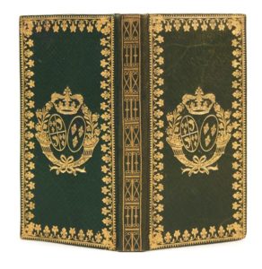 CALENDRIER de la cour pour l'année 1826… Paris, Le Roux-Hérissant, 1826, in-16, maroquin vert à grains longs, dos lisse orné, doublure et gardes de papier fuchsia, tranches dorées (reliure de l'époque). Collation : 219 pp. Édition non citée par John Grand-Carteret. Exemplaire aux armes de la duchesse d'Angoulême (1778-1851), parfaitement conservé. Dimensions : 104 x 54 mm. Provenance : Aubry-Vitet (1845-1930), avec son ex-libris gravé par Agry. Olivier, pl. 2533, fer n° 6 pour un calendrier de la cour de l'année 1830.