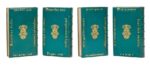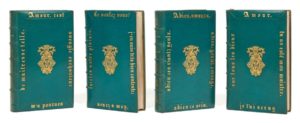 [CURMER L.]. Recueil de photographies. L'Aurore. Le Jour. Le Matin. Le Midi. S.l.n.d. (ca. 1867), 4 vol. in-12, maroquin turquoise, sur les plats, en encadrement une devise en lettres gothiques dorées, armes frappées au centre, dos à nerfs ornés du chiffre [L.C.] entrelacé plusieurs fois répété, doublures ornées d'un semé d'un motif différent pour chaque plat, lion couronné (T. I), fleurs (T. II), fleurettes (T. III), marguerites (T. IV), avec au centre de chaque premier plat de doublure une réserve de maroquin bleu turquoise orné d'un fer floral, gardes de soie moirée jaune, tranches naturelles ([Hardy (?)]). Recueil formé de 4 volumes, réunissant 141 planches montées sur onglets, la plupart sont des photographies contrecollées. Elles représentent Curmer (T. I), A. Dumas avec sa maîtresse Adah Menken (T. III, 2 portraits photographiques, le 1er est un cliché Liebert ca. 1867), des portraits de femmes, d'actrices, des reproductions de tableaux… nombreuses sont légendées. Chaque volume s'ouvre sur un titre aquarellé. À la lecture du catalogue de la vente des manuscrits et livres de l'éditeur Léon Curmer (1801-1870), on peut légitimement penser que cet ensemble ait été confié à Hardy, lequel reçut d'autres commandes de ce bibliophile ardent. Il exerça de 1850 à 1880. Une devise a été frappée en gothique sur les deux plats des reliures de chaque volume : « Amour, cest aveugle enchanteur, M'a pourveu de maitresse telle, Que s'il eut congneu sa haulteur, Lui-même fust serviteur d'elle. » (Premier volume) Chaque volume est logé dans un étui-cigare de maroquin havane doublé en pied et en tête de velours rouge. Dimensions : 159 x 98 mm. Provenances : L. Curmer (Cat., 1874, n° 5) ; A. Vautier (Cat., 1977, n° 175, « Ce recueil figure dans son catalogue mais n'a pas été mis en vente. »).