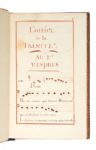 [MANUSCRIT]. [JOURDAN DE LAUNAY] L'Office de la Trinité En latin et en français, manuscrit décoré sur papier France, s.l. [Paris ?], daté 1770 et signé « Fecit Malartus » [II] + 151 pp. (les pp. 150-151 ne sont pas chiffrées et sont blanches à l'exception de l'encadrement), précédés et suivis de deux pages de gardes de papier, manuscrit complet, écriture liturgique romaine, texte et musique inscrit dans des encadrements à l'encre rouge pâle, musique notée carrée sur des portées de 4 lignes tracées à l'encre rouge pâle, rubriques et titres courants à l'encre rouge pâle, certaines capitales à l'encre rouge pâle. Reliure de maroquin rouge, dos à 5 nerfs cloisonné et fleuronné avec les meubles héraldiques répétés dans les entre-nerfs, lettrage doré au dos « Office de la Trinité », triples filets dorés en encadrement sur les plats, armoiries de Bernard-René Jourdan de Launay poussées au centre des plats [OHR, 2317], meubles héraldiques (massue d'or et sauterelle) répétés aux quatre angles des plats, filet doré sur les coupes, roulette intérieure, gardes de papier marbré peigné, tranches dorées. Bel exemplaire (quelques petits frottements au plat inférieur et petites épidermures ; coins un peu émoussés mais sans gravité). Dimensions de la reliure : 200 x 132 ; dimensions des feuillets : 194 x 124 mm. Fort rare provenance. Rare reliure ayant appartenue à Bernard-René Jourdan de Launay, dernier gouverneur de la Bastille (il occupe ses fonctions de 1776-1789). En 1789, Bernard-René Jourdan de (1740-1789) est le gouverneur (peu aimé si l'on en croit Linguet et Michelet) de la prison royale de la Bastille, charge qu'il avait rachetée à son prédécesseur Antoine-Joseph de Jumilhac. Il est reconnu comme celui qui donna l'ordre à ses soldats de tirer sur la foule le 14 juillet 1789. Après la reddition du château Jourdan de Launay est entrainé par les émeutiers vers l'Hôtel de Ville. En place de Grève, malgré la protection de soldats, Bernard-René Jourdan de Launay est poignardé. Sa tête est tranchée et promenée au bout d'une pique avec celle de Jacques de Flesselles, Prévôt des marchands, jusqu'au Palais Royal. On connait une reliure fort semblable recensée dans le Manuel de l'amateur de reliures armoriées françaises par Olivier, Hermal et de Roton [OHR, 2317]. Il s'agit d'un manuscrit calligraphié par Baudouin, calligraphe de la chapelle royale de Versailles, intitulé L'office de Noël (1768, 209 pp.). Ce manuscrit est conservé depuis 2008 à New York, Metropolitan Museum of Art (M2149.5 .C5 1768 : Gift of Jayne Wrightsman). On rappellera l'importance de la collection de Jayne Wrightsman, amateur entre autres de reliures du XVIIIe siècle : un grand nombre d'ouvrages du XVIIIe siècle, finement reliés, furent donnés en 2019 à la Pierpont Morgan Library (voir Exposition New York, Pierpont Morgan Library, Bound for Versailles : The Jayne Wrightsman Bookbindings Collection). Fiche complète dans le catalogue à télécharger.