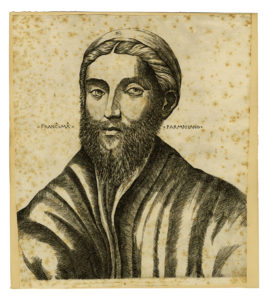 Anonimo del XVI secolo, FRANC. MA. PARMIGIANO (Ritratto del Parmigianino). – 1530-1550. – Bulino. mm 240x214.