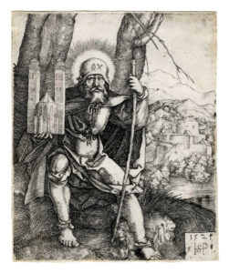 Il santo eremita e patrono di Norimberga è raffigurato con la veste da pellegrino mentre sorregge nella mano destra il modello della chiesa a lui consacrata.