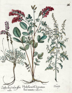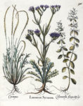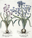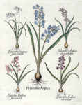 1) Hedysarum Clypeatum..., Onobrychis Dodon flore rubro, Botriis ; 2) Hyacinthus Anglicus, Hyacinthus Anglicus flore incarnato, Hyacinthus Anglicus colore violaceo ; 3) Hyacinthus Orientalis maiorflo:coeruleo, Hyacinthus Orientalis maior violaceo colore. 4) Limonium Syriacum, Calamentha Angustifoliis, Coronopus. Da Hortus Eystettensis. Bellissime prove, stampate su carta vergellata con filigrana "serpente" visibile su tutti i fogli, dall'edizione di lusso del 1613 priva di testo al verso.