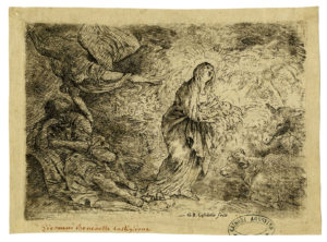 Giovanni Benedetto Castiglione (detto il Grechetto), L'angelo sveglia San Giuseppe. — 1645-1649. — Acquaforte. mm 135x185. — Foglio : mm 155x205.