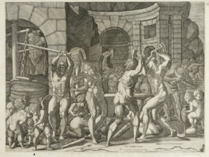 Girolamo Fagiuoli [attribuito a], I Ciclopi forgiano le armi di Amore nella fucina di Vulcano. — 1540-1550. — Bulino. mm 315x417. — Foglio : mm 335x450.