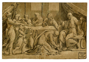 Alessandro Gandini, Cristo in casa di Simone Fariseo. — 1555-1564. — Chiaroscuro a quattro legni nei toni dell'ocra e del grigio-bruno. mm 248x370.