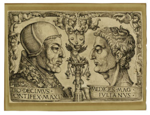 Bartsch, VIII, 84. Hollstein, 93. Con il monogramma sulla colonna in basso al centro e nei cartigli sotto i ritratti l'identificazione dei personaggi "LEO DECIMUS/ PONTIFEX MAXIMUS" e "MEDICES MAG/ IULIANUS".