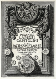 Id., Frontespizio di I.B. Piranesii Lapides Capitolini sive Fasti Consulares Triumphalesq. Romanorum... Roma 1762. Acquaforte. mm 510x355. Foglio : mm 536x412. Ficacci, 477. /