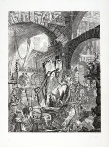 Giovanni Battista Piranesi, L’uomo sulla cremagliera. 1749-1750 [VI edizione, tiratura moderna]. — Acquaforte, bulino, puntasecca, morsura aperta, brunitoio. mm 545x417. — Foglio : mm 700x495.