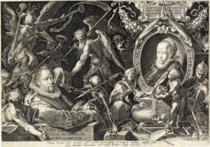 Aegidius Sadeler II, Allegoria della Morte con doppio ritratto di Bartholomäus Spranger e della moglie Christina Müller. — 1600. — Bulino. mm 296x417.