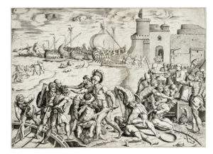 Raffaello Sanzio [da], L'armata cristiana respinge i saraceni al porto di Ostia. — 1540 ca. — Bulino. mm 385x530.