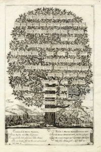 Johann Schweizer Albert Haelwegh, Albero genealogico per Eleonora Gonzaga, con veduta di Firenze. — Darmstadt, 1661. — Bulino. mm 385x250. — Foglio : mm 427x330.