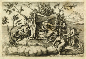 Diana Scultori, Latona partorisce Apollo e Diana nell'isola di Delo. — 1575 / In Roma presso Carlo Losi l'anno 1773. — Bulino. mm 258x384. — Foglio : mm 280x407.