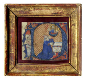 Anonimo del XV secolo, Capolettera decorato e miniato con Cristo Salvator Mundi che appare a vegliardo. — Tempera a colori e pittura oro su pergamena. mm 95x110.