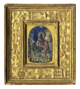 Placchetta centinata a sbalzo in argento e smalto a colori, azzurro, verde vivo, rosa violaceo. cm 7,5x5.