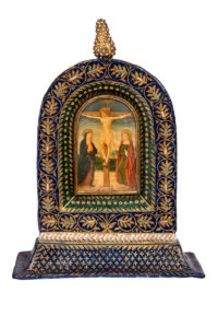 Scuola francese XVI secolo, Altarolo portatile in rame smaltato e crocefissione con dolenti. —
