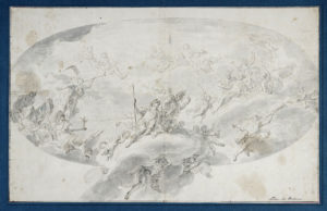 Anonimo della seconda metà del XVII secolo, Convito degli dei. — Penna e inchiostro bruno, pennello e acquerello grigio, minimi rialzi in bianco. Carta vergellata color crema. — Tratto di inquadramento a penna e inchiostro bruno. — In basso a...