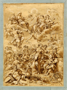 Anonimo del XVIII secolo, Poeta incoronato dalla Fama. — Penna e inchiostro bruno, pennello e acquerello marrone, matita di grafite, minimi rialzi in bianco. — Carta vergellata pesante apparentemente priva di filigrana. mm 332x243.