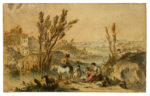 Scuola veneta del XVIII secolo, Due paesaggi con scene di genere. — 1735-1770 ca. — Penna e inchiostro bruno, pennello e acquerello a colori, su carta vergellata color avorio con filigrana "giglio di Strasburgo D&C BLAW" su uno dei fogli e...