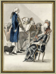 Scena di costume di buona qualità pervenuta come di scuola veneta del XVIII secolo, forse considerando la figura della dama anziana seduta sul primo piano, in particolare la sua elaborata e fantasiosa acconciatura, da ipotizzare di ambito inglese con sentore delle caricature della società di Fussli.